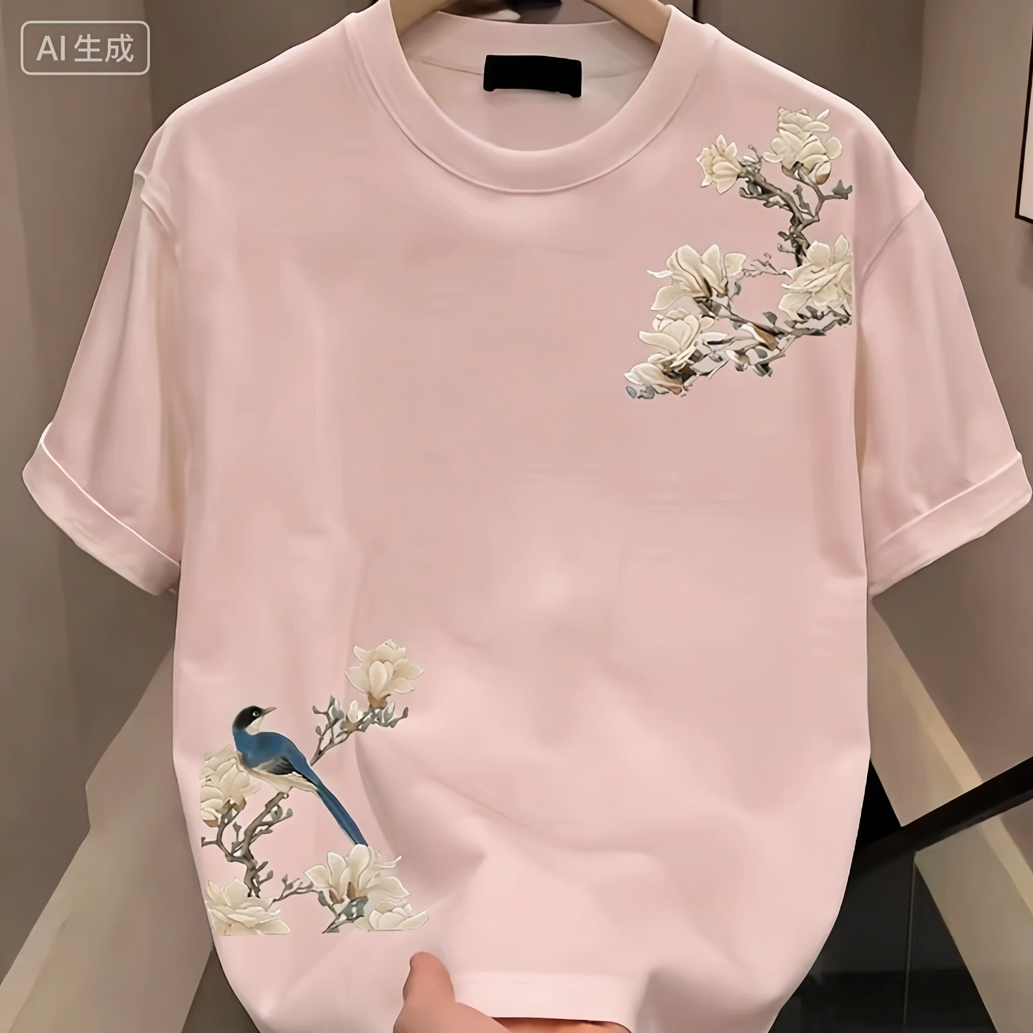 Summer Casual Men’s 100% Cotton Versatile Round-neck Short-sleeved T-shirt with Floral Pattern Print Outdoor Soft and Breathable