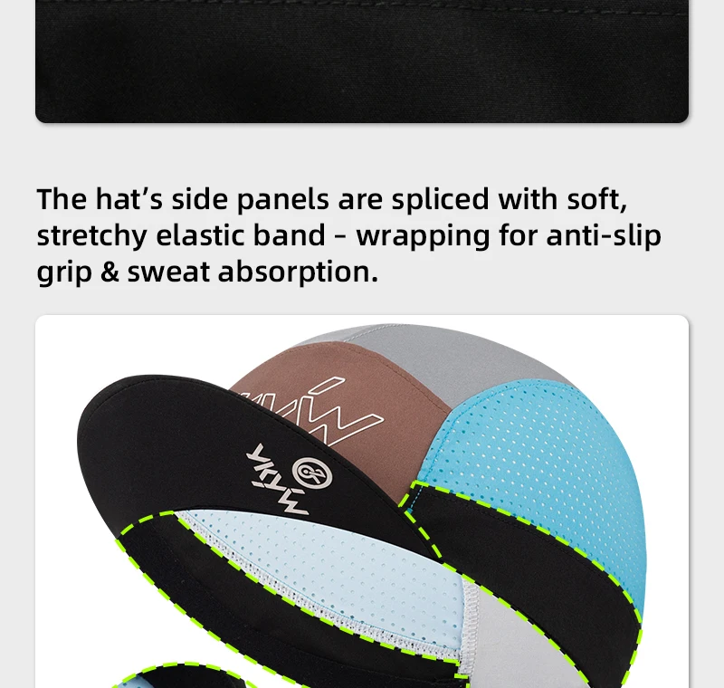 •The hat's side panels are spliced with soft, stretchy elastic band- wrapping for anti-slip grip & sweat absorption.